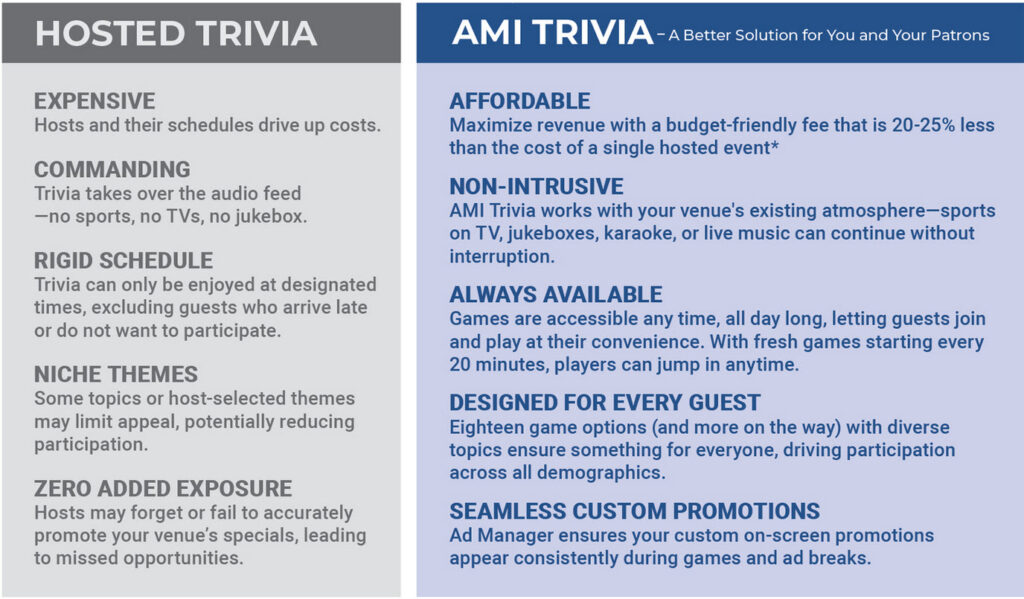 As the comparison table shows, hosted trivia often takes over your sound system, forcing sports, music, or jukebox play to stop. AMI Trivia is designed to do the opposite.