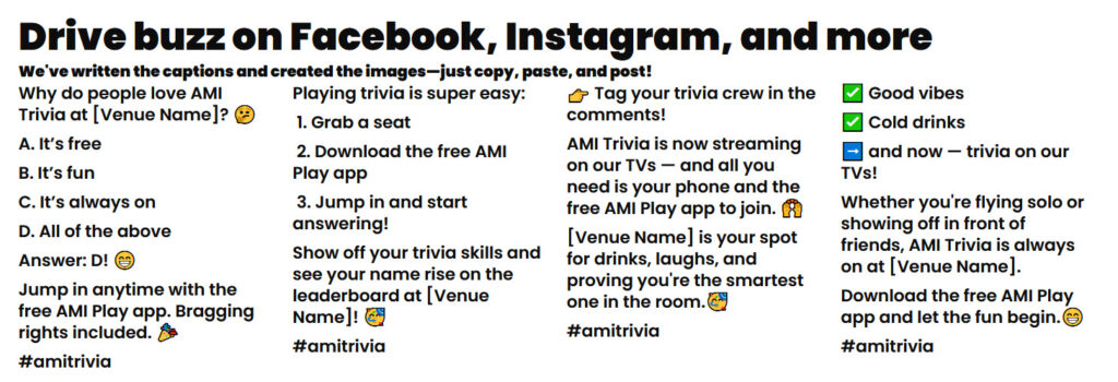 Here’s some of the FAQ’s from AMI to help you get ready for trivia! Plus AMI has print resources all ready for you to use to get promoting Trivia immediately. So easy with GAD and AMI.
